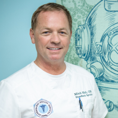 Scott Mitchell Hall, CHS, DMT is a Hyperbaric & Dive Medicine Specialist since 2012. Mitch began his hyperbaric career as a Certified Mixed-gas Commercial Diver, Diver Medical Technician, Hyperbaric Chamber Technician and Emergency Medical Technician. It was through his training in the treatment of injured divers that he discovered the healing effects of hyperbaric oxygen in a wide variety of injuries and diseases. Mitch was inspired to begin a journey into the medical profession where he sought to utilize this knowledge in a clinical setting.